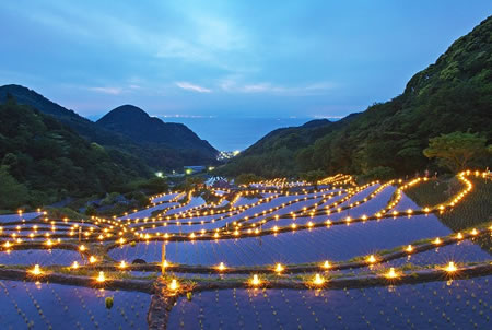 田植えを終えたばかりの棚田にキャンドルのきらめきが美しいです。5月。
