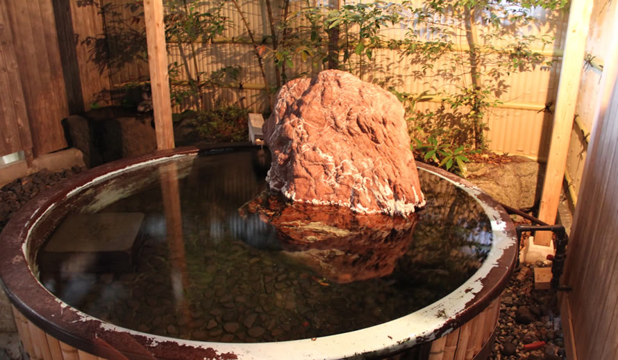 貴重な伊豆石を使用した湯舟は、遠赤外線効果で温泉の効能を高めます。