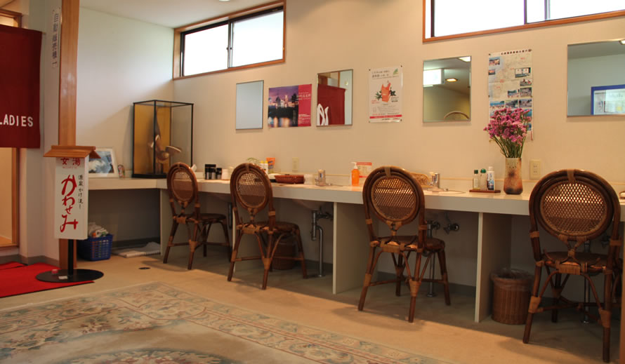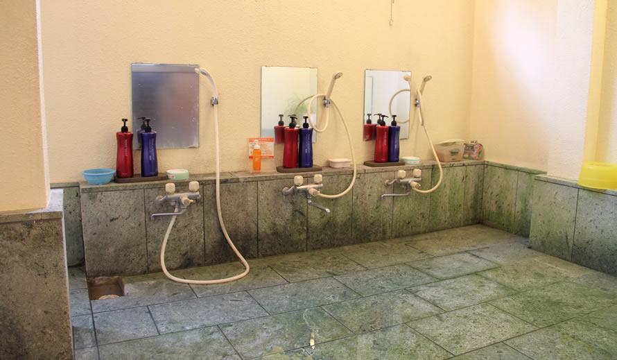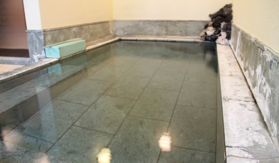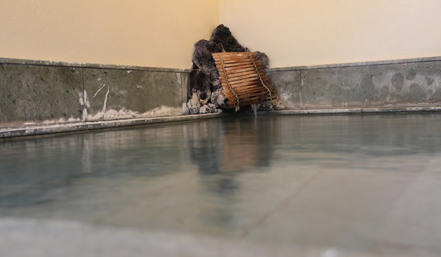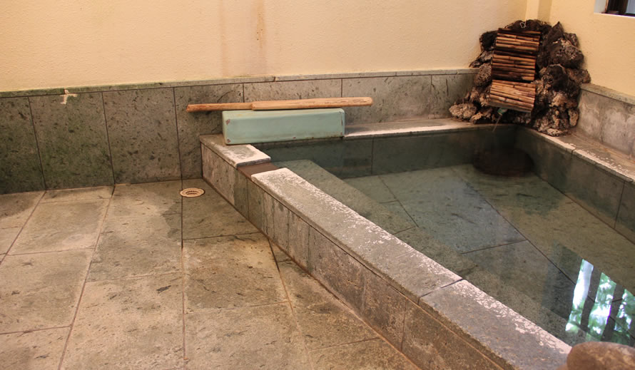 | 内湯 | 「男湯」「女湯」「家族風呂」 内湯の湯舟は伊豆産の「伊豆石」を使用しております。 伊豆半島が海底火山だったころに生まれた石ともいえます。 今では採掘されていない貴重な石です。 |