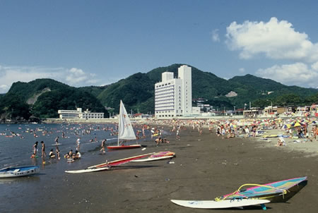 当館から徒歩6分ほどにある、松崎海水浴場。遠浅で波も静かなことから、親子連れにも人気の海岸。シーカヤックなどのマリンスポーツも楽しめます。
